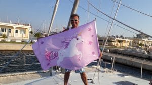 Einhornflagge – hat Jana mitgebracht. Und hat die ganze Fahrt durchs Mittelmeer überlebt. Also die Flagge 😉